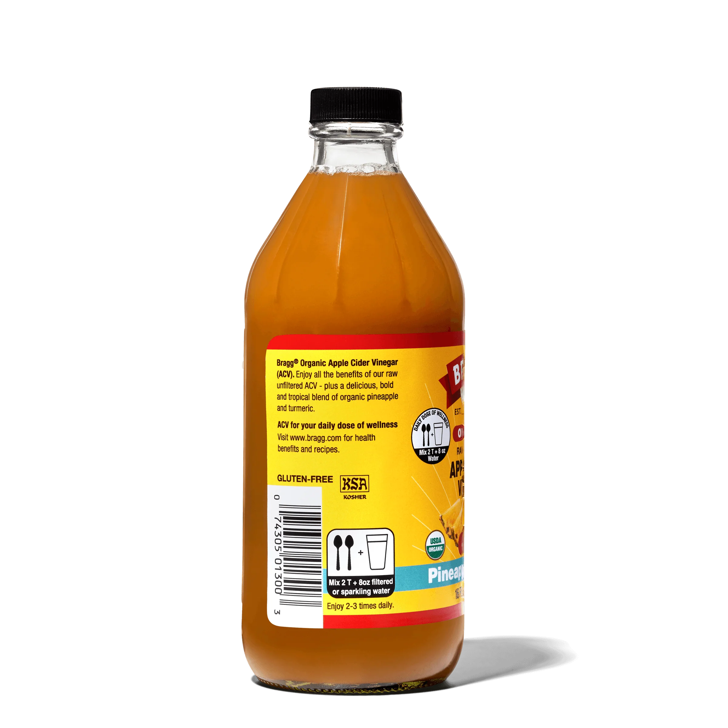Get swept away to wellness paradise with this tangy, tropical mix of organic Bragg® Apple Cider Vinegar, organic pineapple, and turmeric. Crafted with real, flavorful ingredients, Pineapple Turmeric Apple Cider Vinegar Blend offers a range of benefits, including 750 mg of acetic acid per serving.